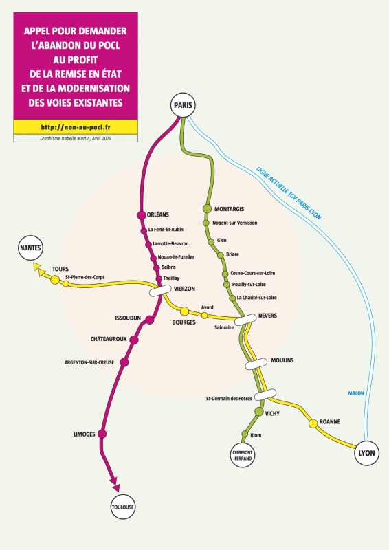 Alors que le projet de construction d'une ligne à grande vitesse (LGV) Paris-Orléans-Clermont-Ferrand-Lyon (POCL) est dans sa phase d’aboutissement, nous constatons le lent déclin du service des trains sur les trois grandes lignes qui desservent le grand centre de la France* : la réalisation du POCL se fera au détriment de l'avenir de nos lignes existantes.